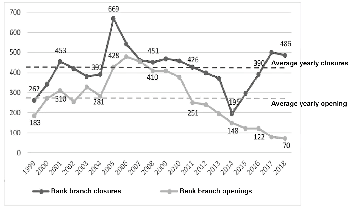 Graph 1 shows the annual branch openings and closures during this time. If we compare the curve of closures to the yearly average for the 1999-2018 period (418 branches), it shows that this phenomenon is not a recent one.