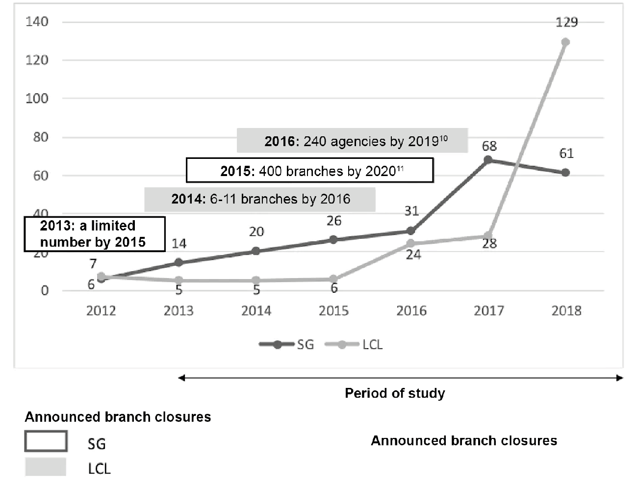 We compiled the choices and causes behind the closures by undertaking documentary research (count and content analysis of 91 articles from the national and regional daily economic press published between 2012 and 2018). The main common theme that emerged is that LCL and SG announced major branch closures during this period as a key part of their strategic plans.
