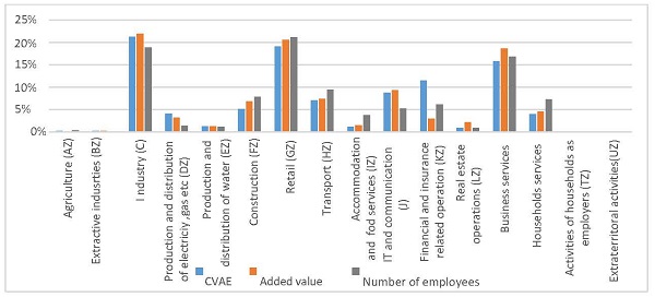 Share of each sector in 2020 in CVAE, added value and number of employees of companies contributing to CVAE