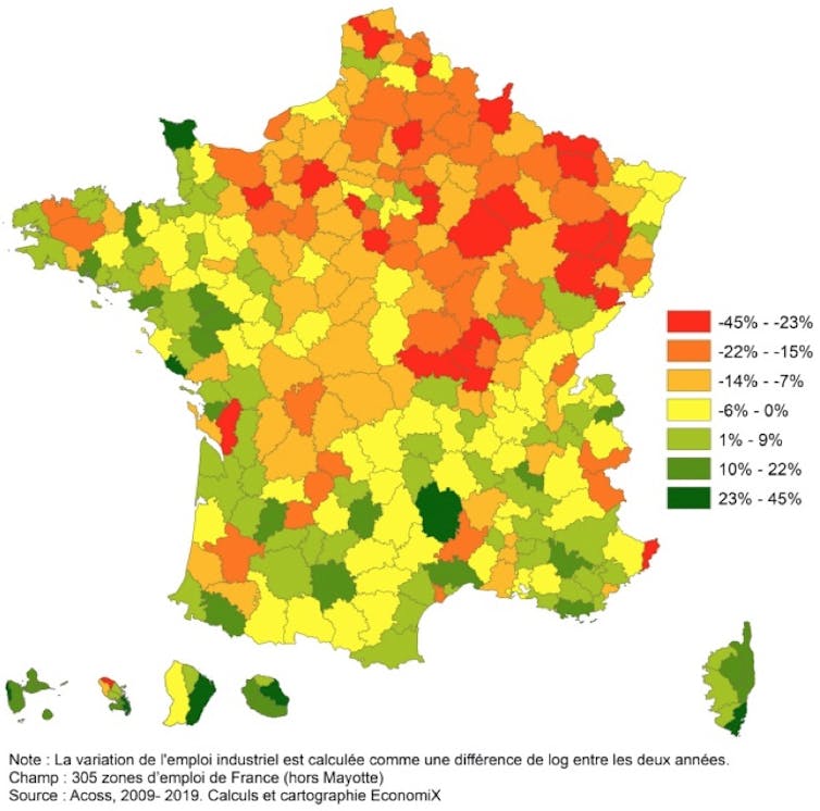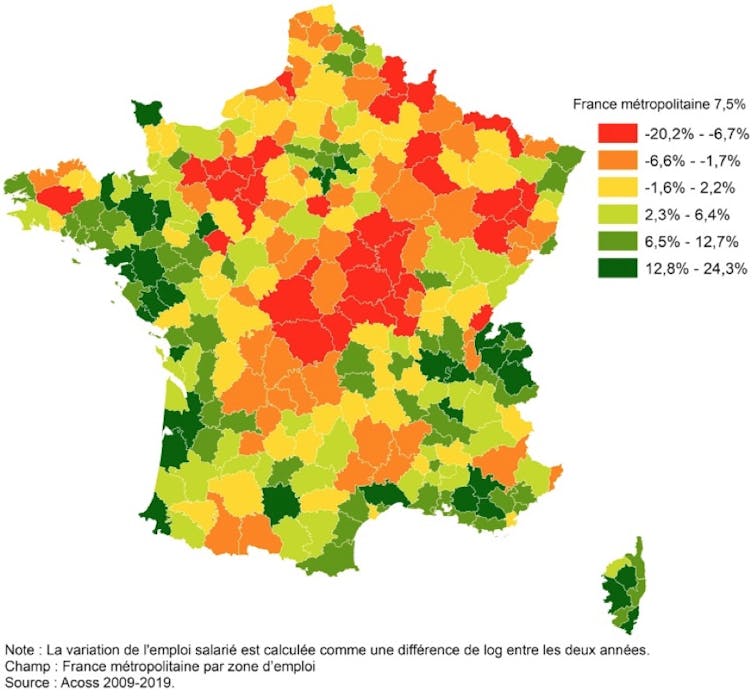L’évolution de l’emploi salarié privé, total et dans l’industrie (voir cartes ci-dessous) à l’échelle des zones d’emploi, reflète le maintien, voire l’aggravation, des disparités entre « la diagonale aride » et les façades maritimes. Pour rappel, une zone d’emploi désigne un ensemble de communes dans lequel la plupart des actifs résident et travaillent, et où les établissements peuvent trouver l’essentiel de leur main-d’œuvre. Le découpage réalisé par L’Institut national de la statistique et des études économiques (Insee) en 2020 identifie 305 zones d’emploi. Elle est considérée comme la maille spatiale la plus adaptée à l’étude des économies locales.