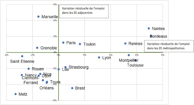 Pour autant, toutes les métropoles ne se portent pas bien. Si Rennes, Nantes et Bordeaux connaissent un taux de croissance de l’emploi positif, nombreuses sont celles qui présentent aussi des difficultés (Grenoble et Saint-Étienne par exemple). La situation des métropoles centres peut, en outre, co-évoluer de différentes manières avec celle des zones d’emploi mitoyennes. Sur la figure ci-dessous, on voit ainsi que certaines métropoles affichent une dynamique de l’emploi (variation résiduelle de l’emploi dans les ZE métropolitaines) similaire à celle de leur périphérie (variation résiduelle de l’emploi dans les ZE adjacentes). Cette coévolution peut être positive comme dans les trois métropoles de l’Ouest ou négative comme à Metz, Clermont-Ferrand ou Nancy. Les évolutions peuvent aussi être opposées comme à Marseille où des emplois sont créés au centre mais détruits en périphérie alors que l’inverse se produit à Strasbourg ou Brest. Cette variété des situations remet largement en cause les politiques centrées sur les seules métropoles au profit de démarches mieux ancrées territorialement.
