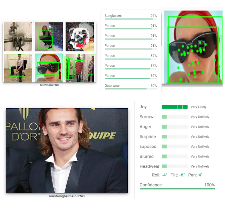 Nous avons utilisé l’outil Google Cloud Vision – très peu répandu dans l’univers de la recherche académique – qui permet d’analyser des réseaux très visuels comme Instagram. Il détecte les objets, mais catégorise aussi les sentiments des personnes mises en scène, ou encore les palettes de couleur des photos publiées. Cette intelligence artificielle classe les éléments qu’elle reconnaît dans les images et leur associe des mots les qualifiant.